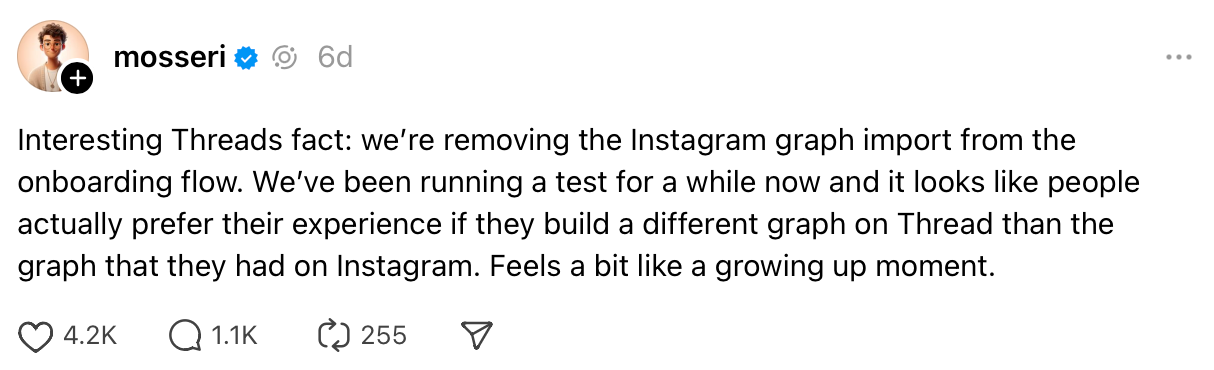 Bluesky successfully recreates a lot of Twitter's vibrant, weird, funny community. They're doing everything right from a product perspective. They have a polished user experience. They offer both a chronological feed and an algorithmic one. They get how to grow an interest graph, with features like Starter Packs quickly connecting new users to their interests.