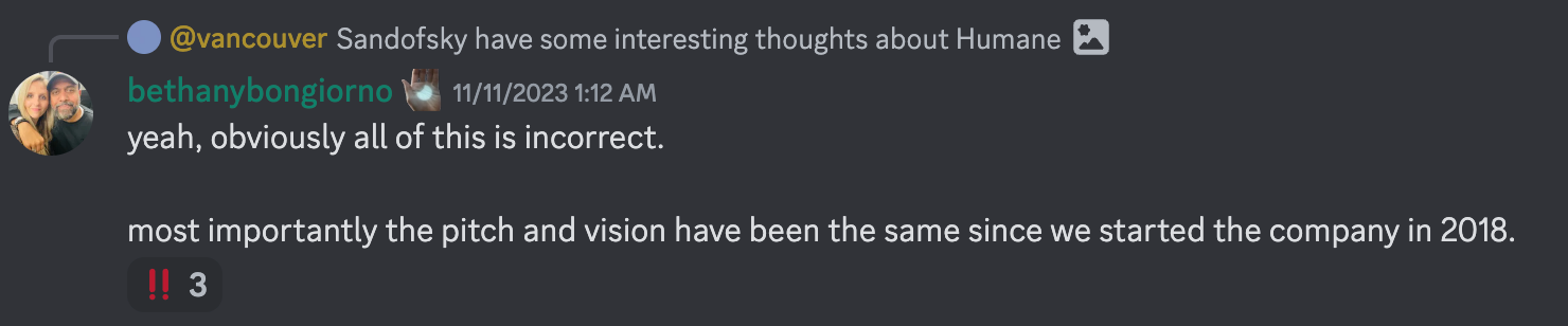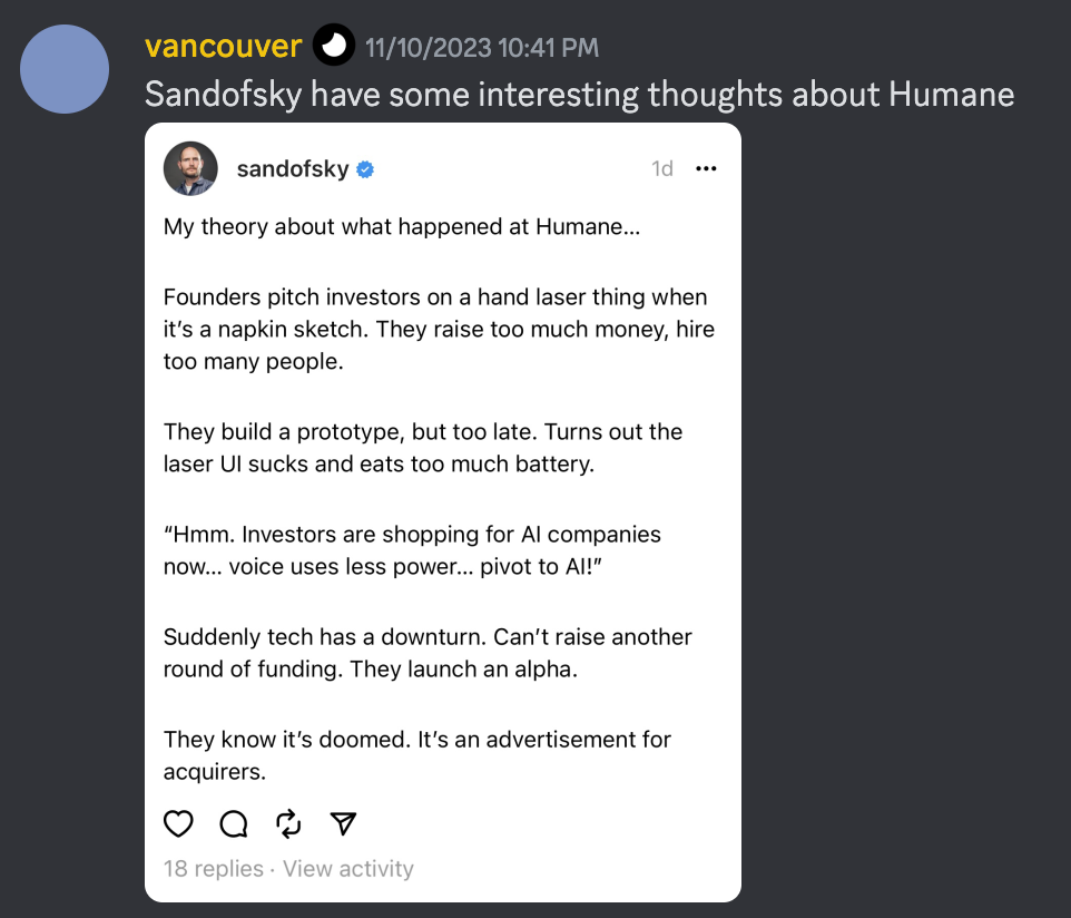 I tweeted my theory about an AI pivot in November 2023, and it found its way to the official Humane fan Discord. (Yes, Humane setup a fan Discord before announcing any sort of product. They also ran a podcast dedicated to how awesome they were.)