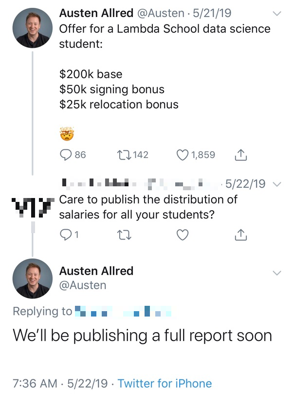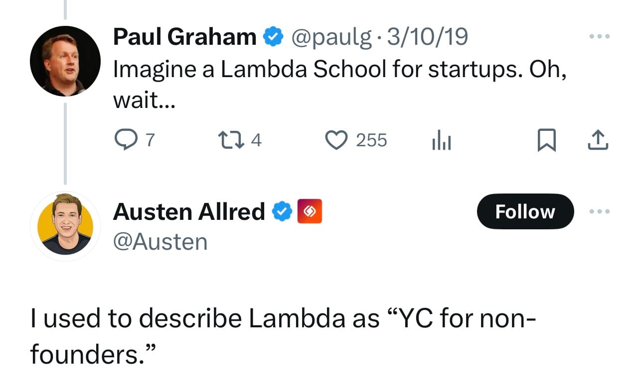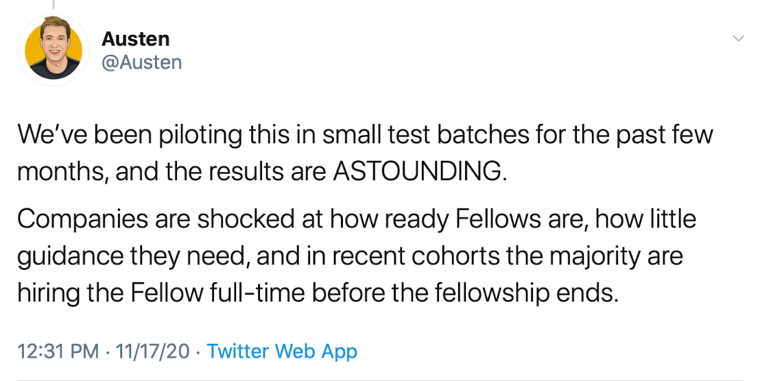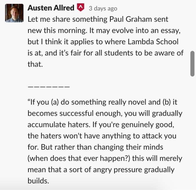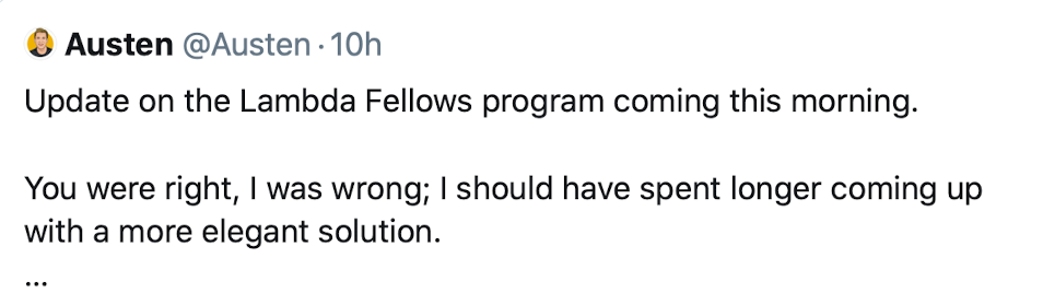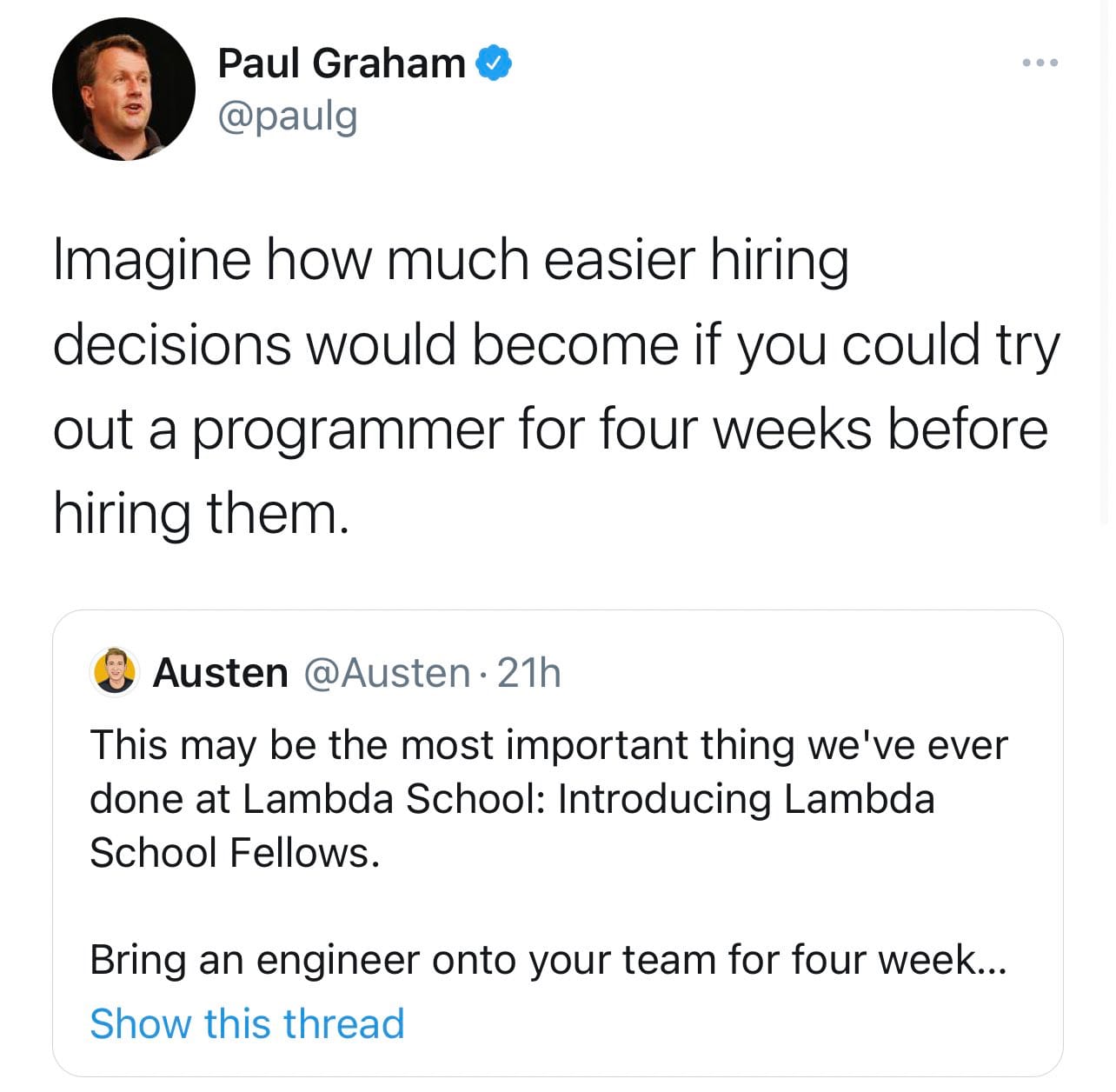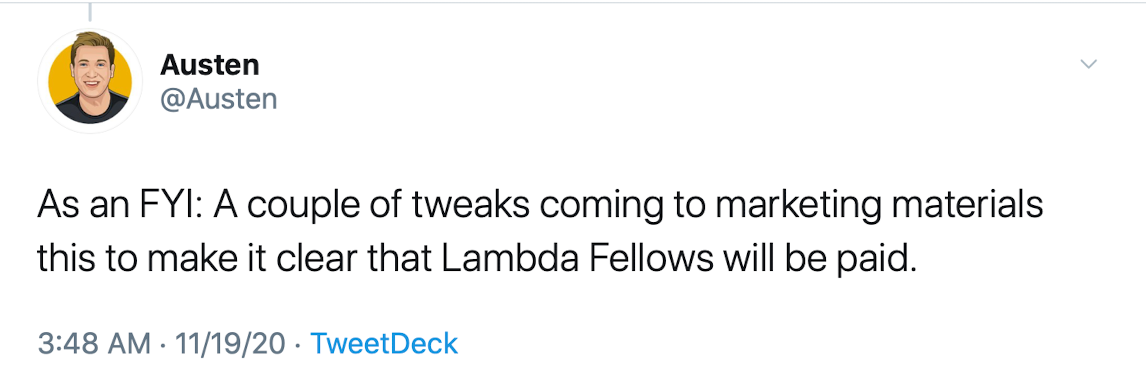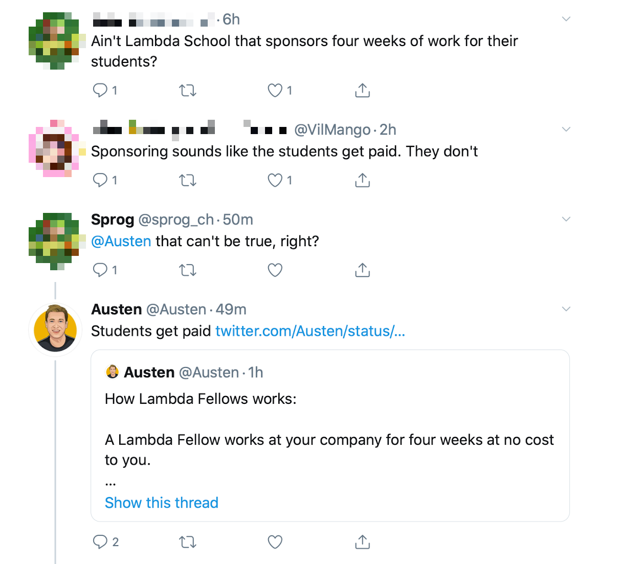 In another incident on Hacker News, I mentioned Lambda School's unpaid intern program, Lambda Fellows. Austen replied: