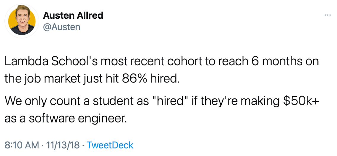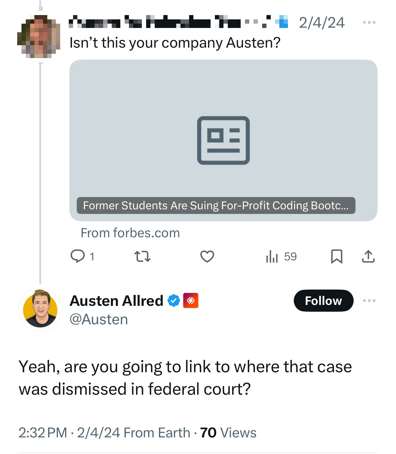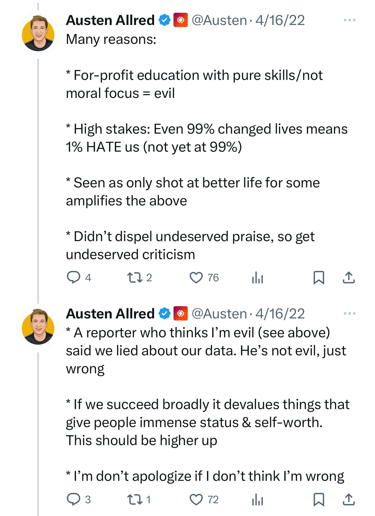 Consider the time Austen tweeted that 100% of the students in his UX class had been hired, when only one student graduated. I confronted him about it on Hacker News, pointing to screenshots in The Verge article. He replied: