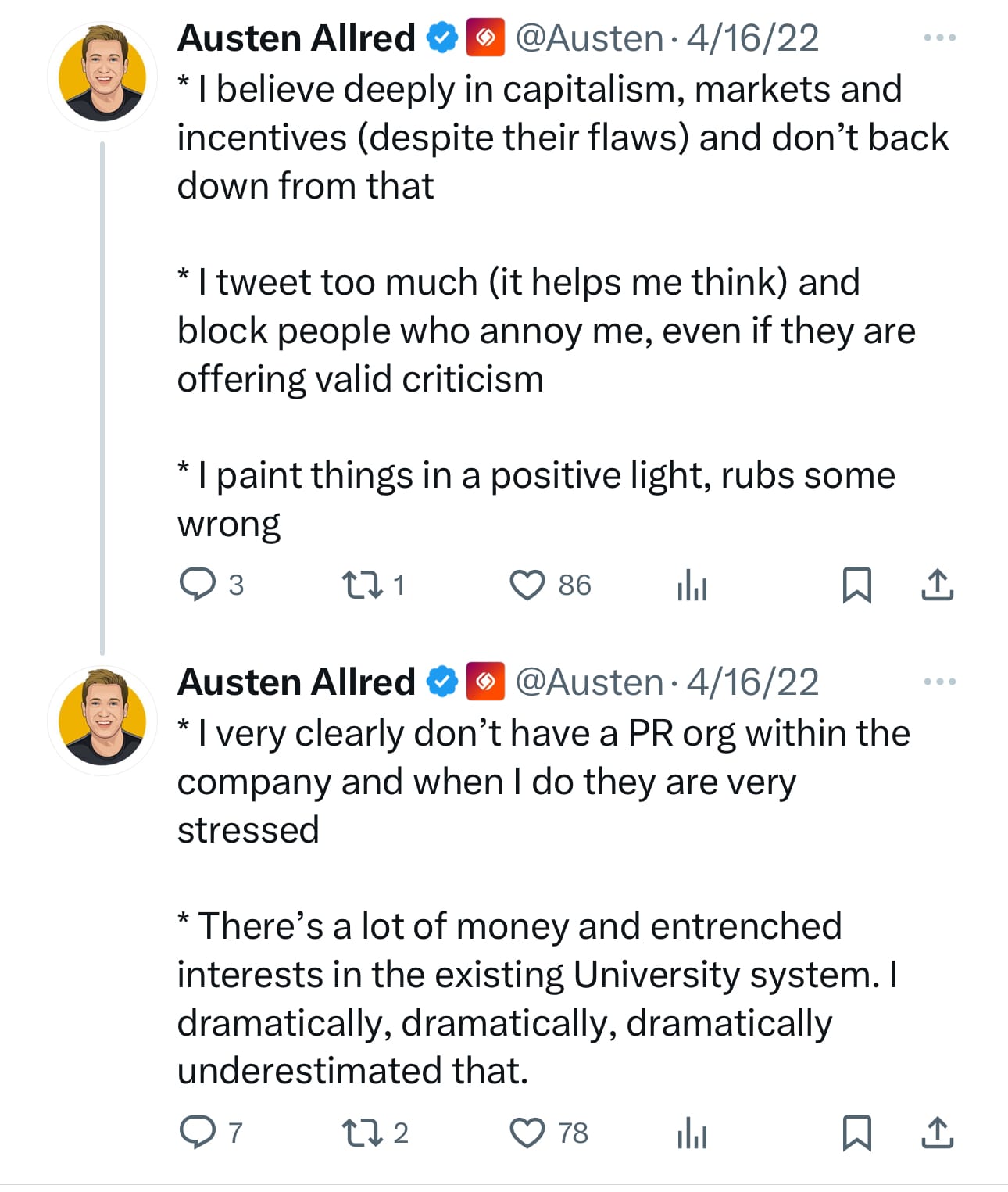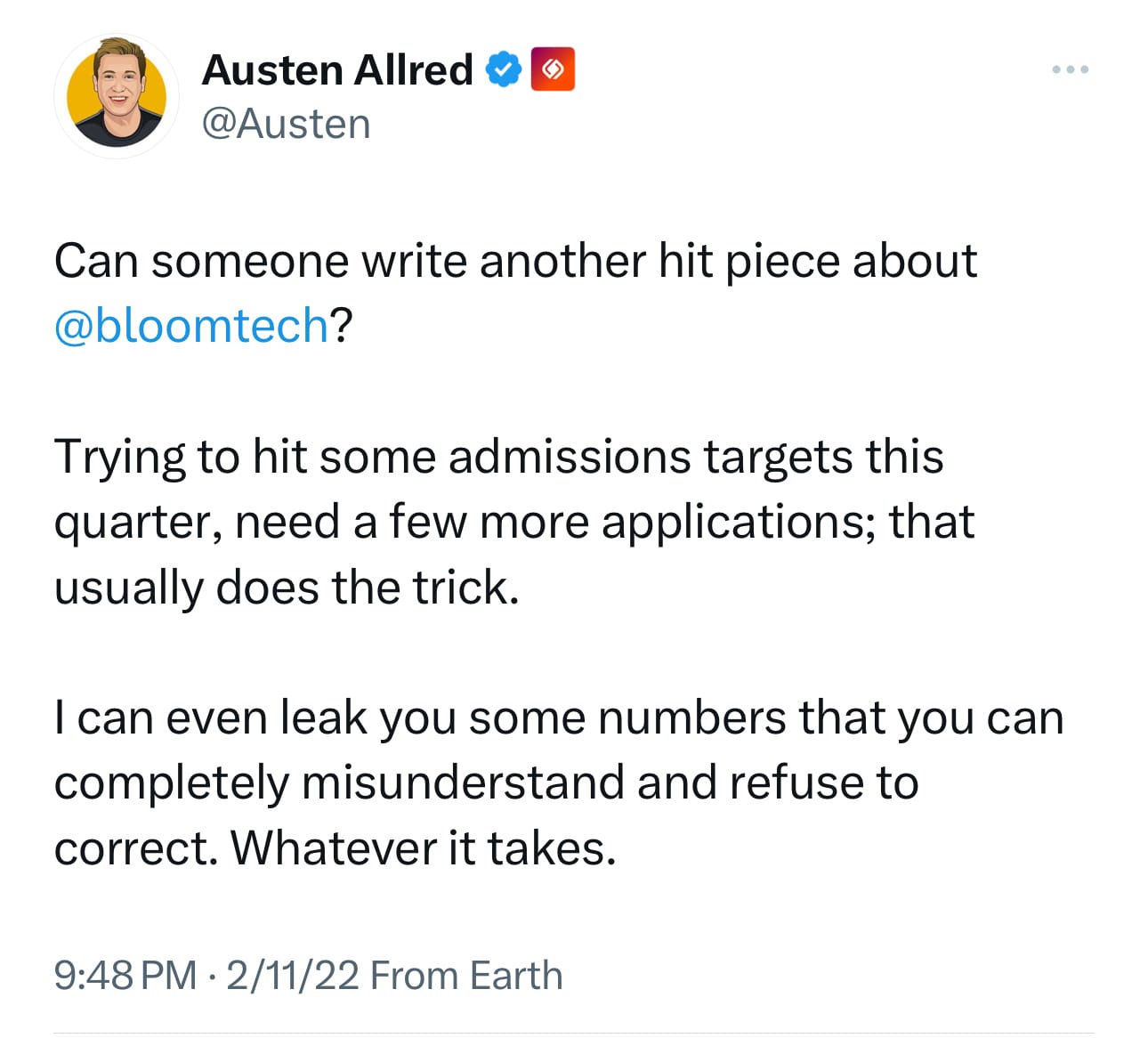 Other unscrupulous bootcamps never face the scrutiny or Lambda School, and I'm certain that other startup CEOs commit crimes but never face personal charges. Austen wouldn't have faced consequences if he hadn't tweeted the smoking guns that took him down. He seems to care more about attention than success, like he'd rather be hated than forgotten.