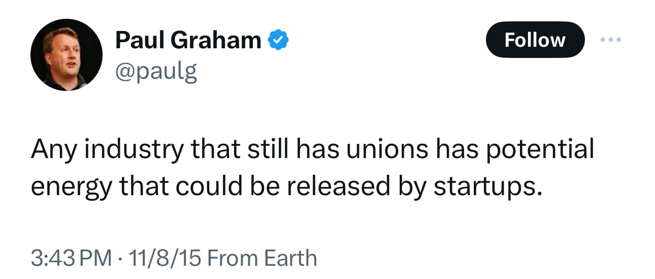 I think VCs were blinded by ideology. Silicon Valley leans libertarian, with part-time Y Combinator partner Peter Thiel bemoaning college and offering $100,000 to entrepreneurs willing to skip it to build a startup. Thiel's donation of $1.25M to Trump's 2016 campaign, along with a rousing endorsement at the Republican National Convention, finally created enough backlash to cause the firm to sever ties, but Y Combinator's founder, Paul Graham, sits so adjacent to Thiel that Graham even asks him to review his blog posts. Graham is the type of guy who thinks his early investment in DoorDash was a good thing for the world.