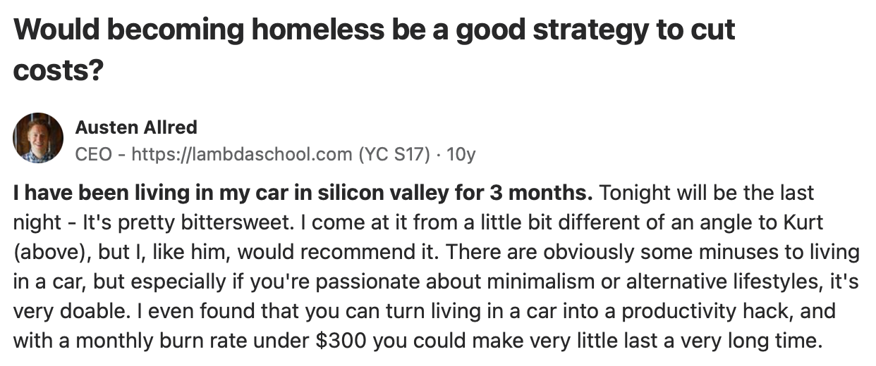 Austen distorted his past to recruit students who were genuinely homeless. Jesse Horne first experienced homelessness at 17 years old, due to family issues and mental health problems. Austen replied on Hacker News, "Hi Jesse, I'm also formerly homeless…" before pitching him on Lambda School's latest innovation: a GoFundMe to send the homeless to Lambda School.