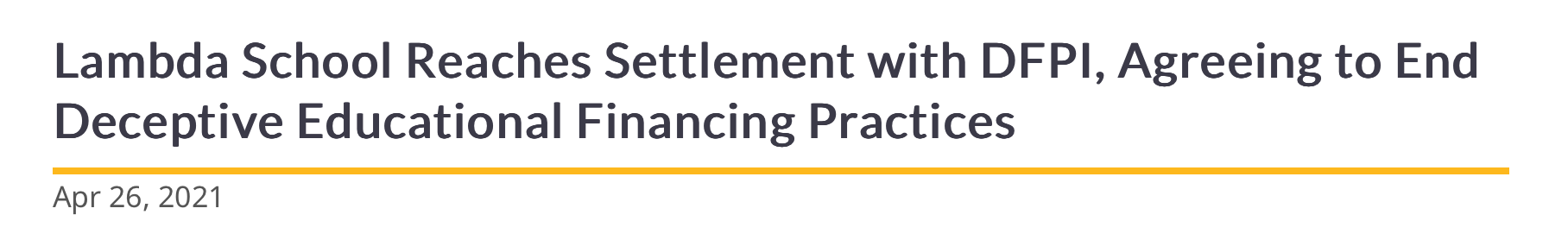 Believe it or not, until January 1, 2021, there were no laws in California to protect consumers from a lie in Lambda School's contracts; the company claimed students they were taking on student loans that couldn't be discharged in bankruptcy, which was completely false. In January of 2021, AB 1864 went into effect, and California's financial protection bureau laid down the law.