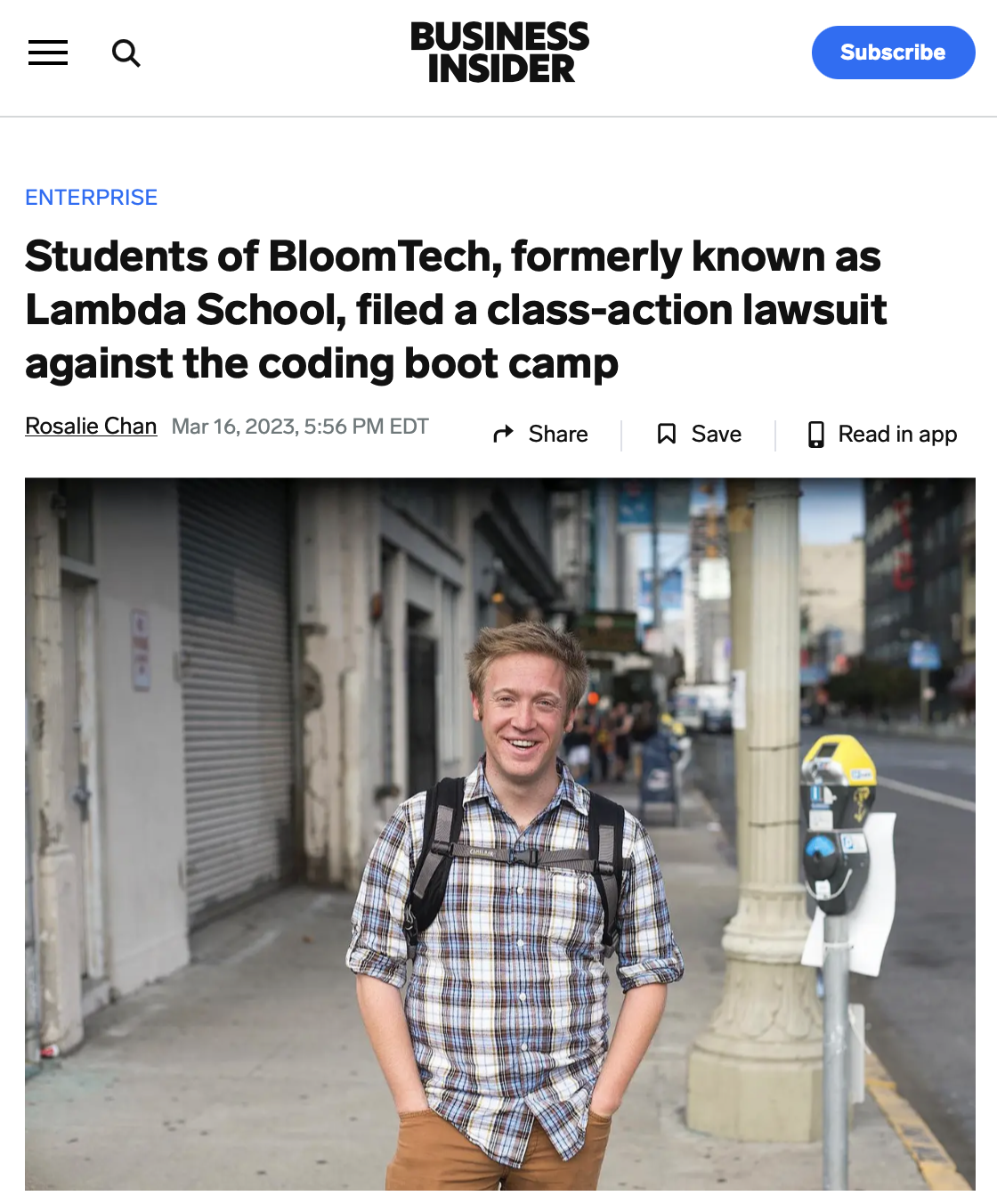 Alongside the pivot away from ISAs, the company changed its name to "The Bloom Institute of Technology." Everyone on the Internet rightfully assumed it was to escape the negative publicity, like when Philip Morris renamed itself Altria. If you Googled "Lambda School" at the time, the first page turned up their crimes and painted the picture of a school on the cusp of collapse.