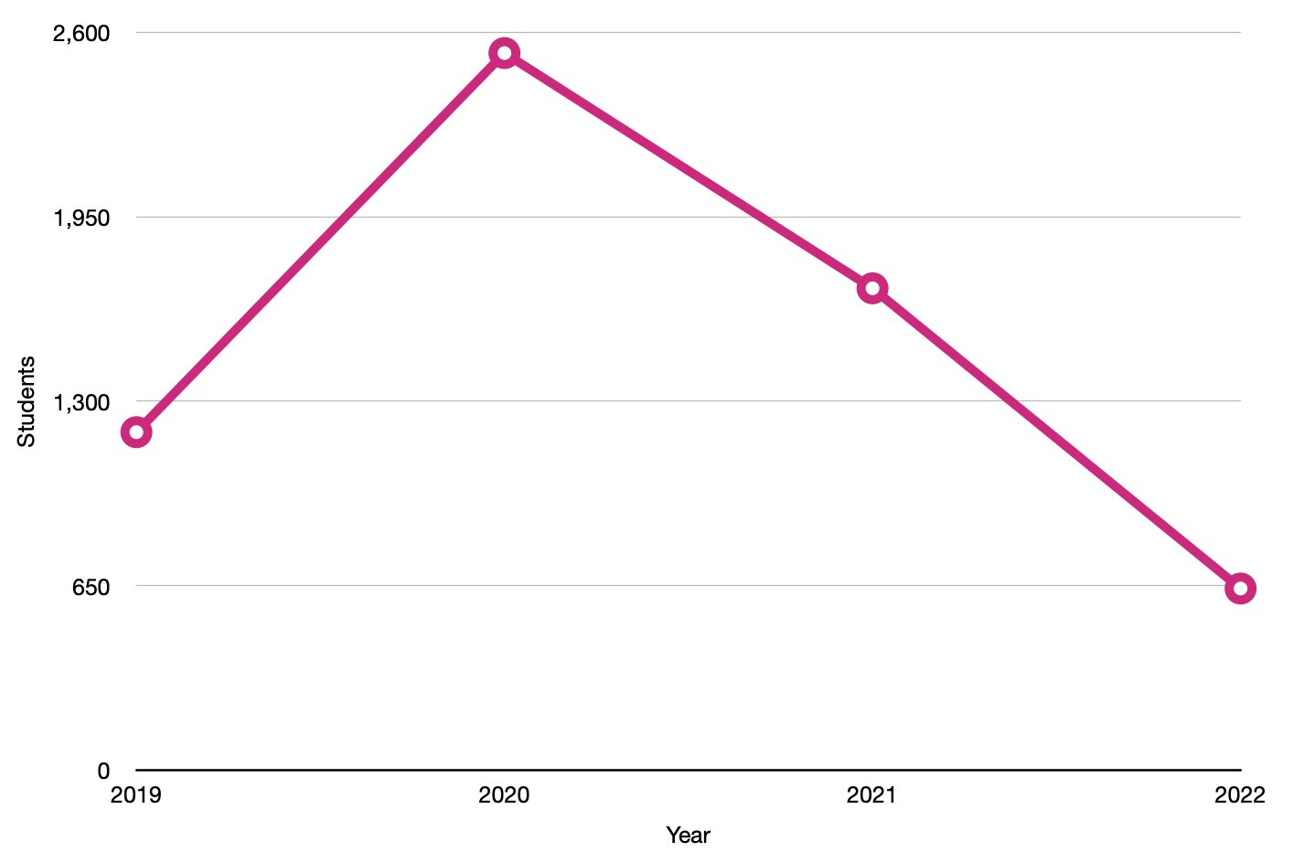 Following Woo's reporting, Lambda School was pressured to publish regular, audited job reports. Those reports included the total number of students who attend every year, and if you graph it you see a company in freefall.