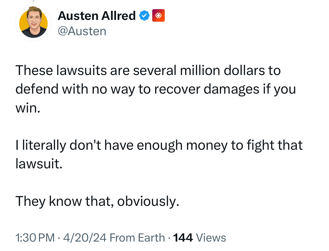 Just as Lambda School sold the dream that anyone can get a job as a developer with a few months of grind, Austen was sold the dream if he just works enough hours, someday he'll become Elon Musk. But the world doesn't work like a Silicon Valley startup, and while the wheels of justice turn slowly, they grind exceedingly fine. Just as his victims couldn't afford a day in court, Austen finds himself in a similar situation, oblivious to the irony.