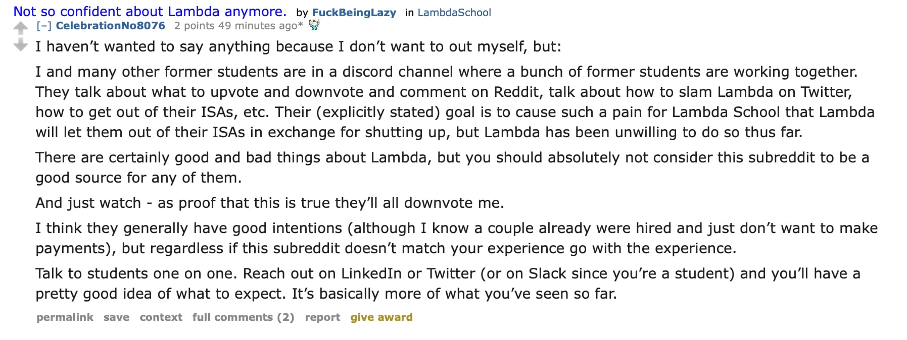 This all happened mid-program, screwing over students already on the hook for tens of thousands of dollars of debt. Soon, students formed their own Discord to consider legal options, and the official Lambda School subreddit was flooded with angry students revolting against the changes.