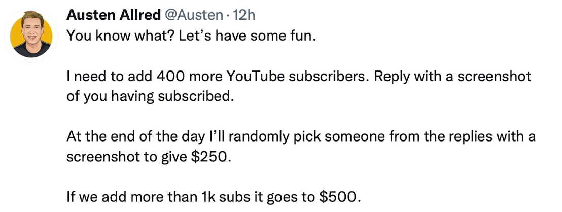 For example, Austen launched a YouTube channel last year. He repeatedly plugged it on Twitter, and even offered money to followers to help him cross 1,000 subscribers.