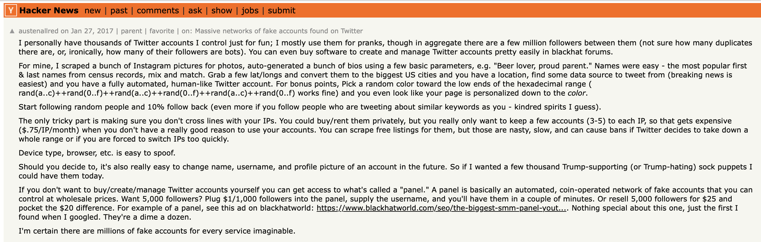 At the time, Austen's 53,000 followers on Twitter created an illusion of importance. At least, until you come across his bragging about a bot army and follow spam on Hacker News.