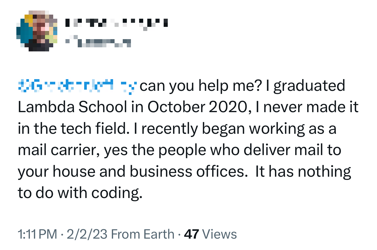 While his mind went to his own greatness, mine turned to his victims. I began tweeting about Lambda School in 2019, and the more I tweeted, the more students shared messages like this: